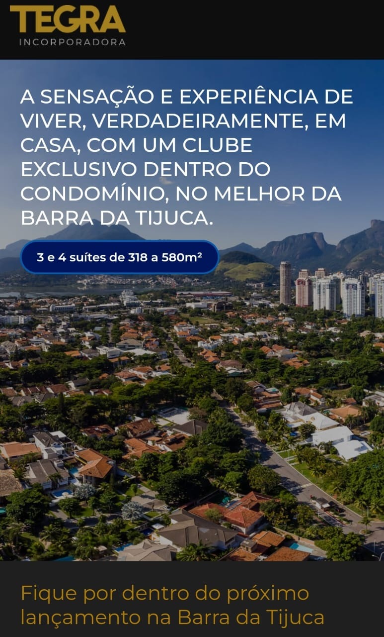 Descrições: Lançamento da TEGRA no Parque das Rosas??? ?Previsão: Novembro 2022Área terreno: 21.000m2? 99 casas??Tipologia: 3 e 4 suítes (possibilidade de até 5 quartos)? Metragem: 318 a 580 m2? Unidades com Garden (possibilidade inclusão de piscina e churrasqueira)? Vagas de garagem no subsolo com box individual ?????????? Clube privativo (3.600m2)?? Balsa para praia? Direito de uso do Ônibus da associação dos moradores? Serviços Pay Per Use? Delibery Center?? Beach Facilities?Endereço: Av. Prefeito Dulcidio Cardoso, 2900. Parque das Rosas - Barra da Tijuca.Fale conosco: 97630-7000 - 05/11/2024