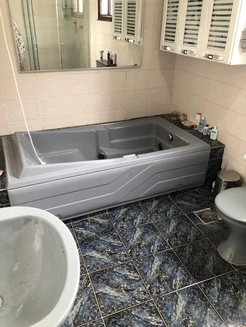 Quintal com piscina, churrasqueira banheiro e área de serviço.