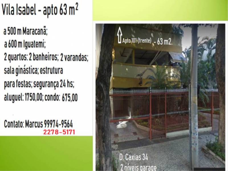 Vila Isabel - frente Rua D. de Caxias, 34/101 - 64 m2. Aluguel: R$ 1350,00 - Condomínio: 800,00 IPTU: 90,00 (mensal) Equipamentos: churrasqueira, academia, bicicletário, 2 elevadores, guarita 24 hs, salão de festas, brinquedos, vagas de carro livres. Sala, quarto maior com varanda e toldo,...